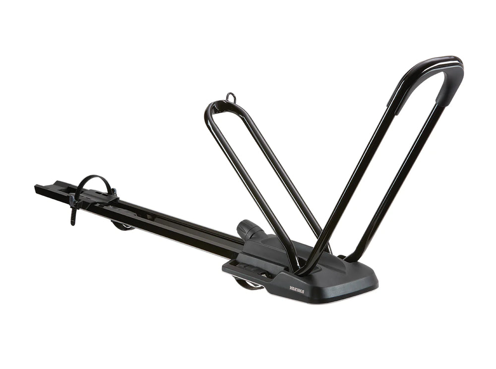 Secure, sleek, and simple to use, the HighRoad is Yakima's premium upright bike mount. The adjustment-free hoop, with its TorqueRight™ tightening knob, loads a variety of bikes quickly and easily. The HighRoad secures the bike by the wheels for ultimate bike protection and the low-profile design minimizes hatch interference. Universal mounting hardware fits most roof racks.